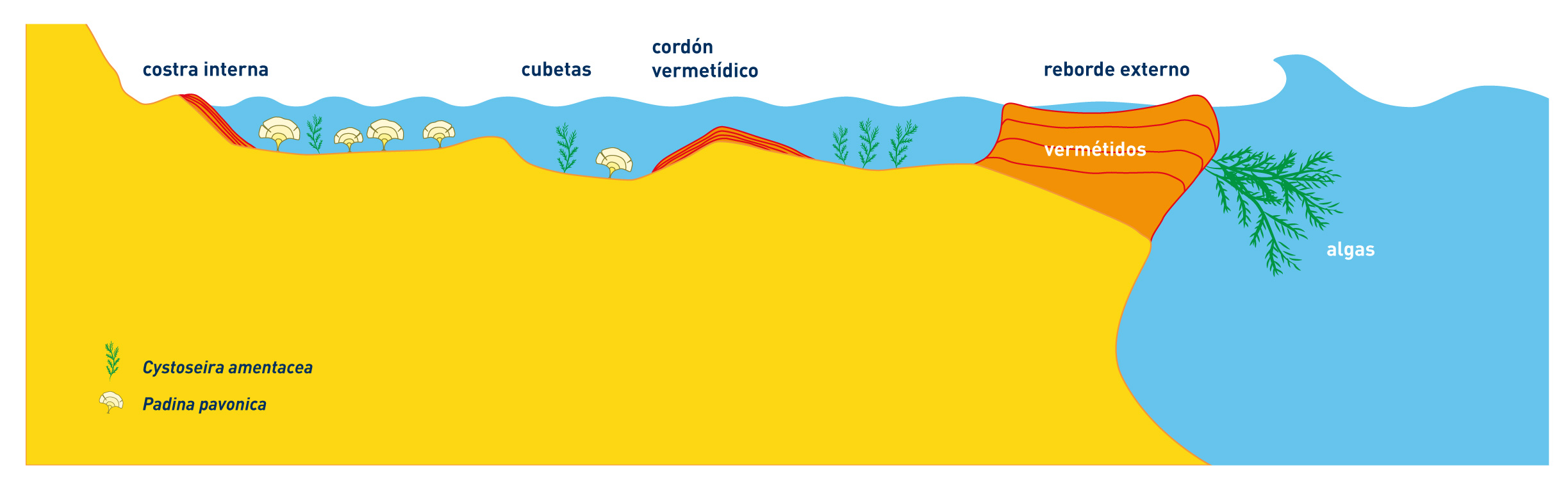 SABÍAS QUE ... el crecimiento de los arrecifes de algas y vermétidos es muy lento. En caso de sufrir daños necesitan decenas de años para recuperarse. Los estudios isotópicos muestran que los arrecifes vivos pueden tener una edad de varios centenares de años.